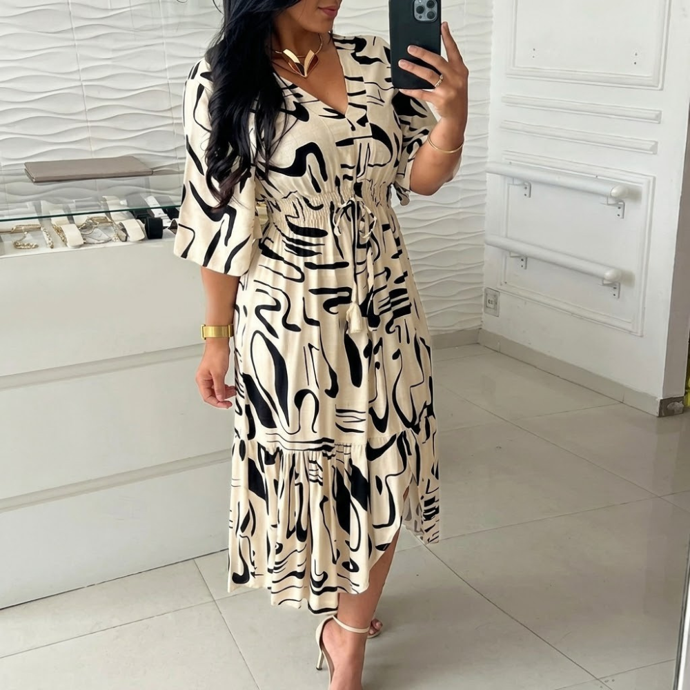 Step into the season with undeniable elegance in this Autumn V-Neck Printed Dress. Thoughtfully designed with a flattering cinched waist, delicate pleats, and graceful five-quarter sleeves, this dress speaks fluent sophistication. The eye-catching print enhances the feminine silhouette, while the sexy yet tasteful V-neckline adds just the right amount of allure. Falling just at the knee, it transitions seamlessly from daytime charm to evening allure, making it your new favorite for every autumn occasion.